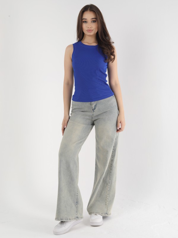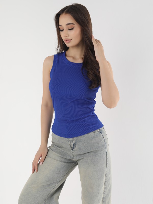 Эластичная и приятная к телу майка в насыщенном синем цвете. Выполнена из рельефной ткани рибана, отлично сидит по фигуре и сохраняет форму даже после множества стирок. Подходит для повседневного образа, спорта или домашнего комфорта.