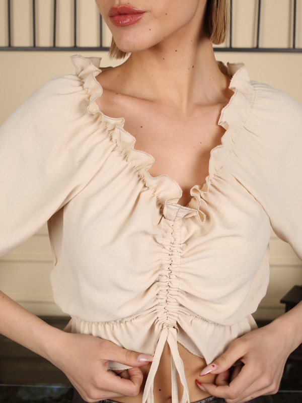 Нежная укороченная блуза в бежевом цвете с романтичными сборками по центру. Модель выполнена из лёгкой струящейся ткани, декорирована завязками и аккуратной оборкой по вырезу. Свободные рукава ¾ на резинке придают образу лёгкость и женственность.