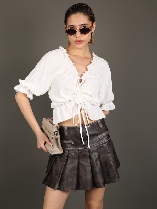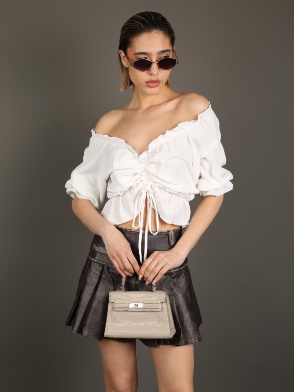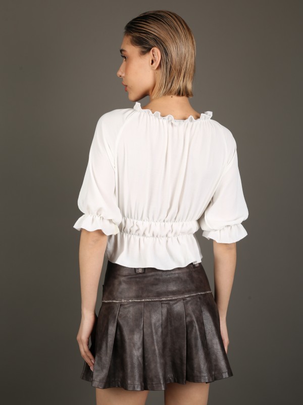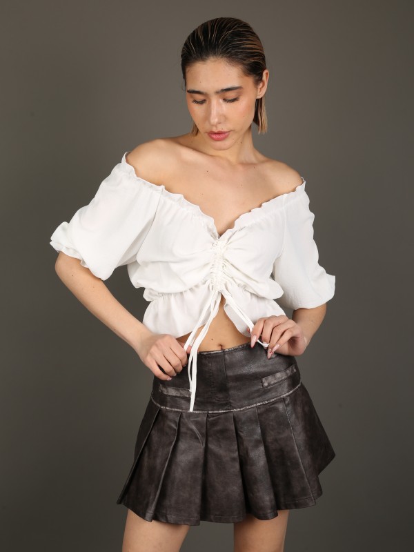 Лёгкая и романтичная блуза с открытыми плечами в белом цвете. Модель выполнена из воздушной ткани, украшена сборкой и завязками по центру для идеальной посадки. Свободный крой и рукава ¾ делают образ нежным и непринуждённым — отлично подходит для прогулок и летних встреч.
