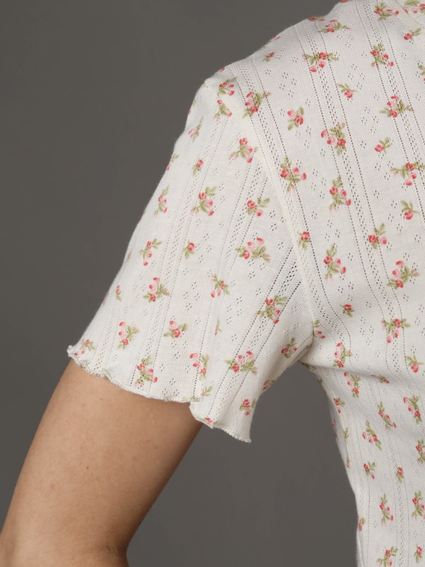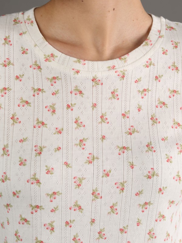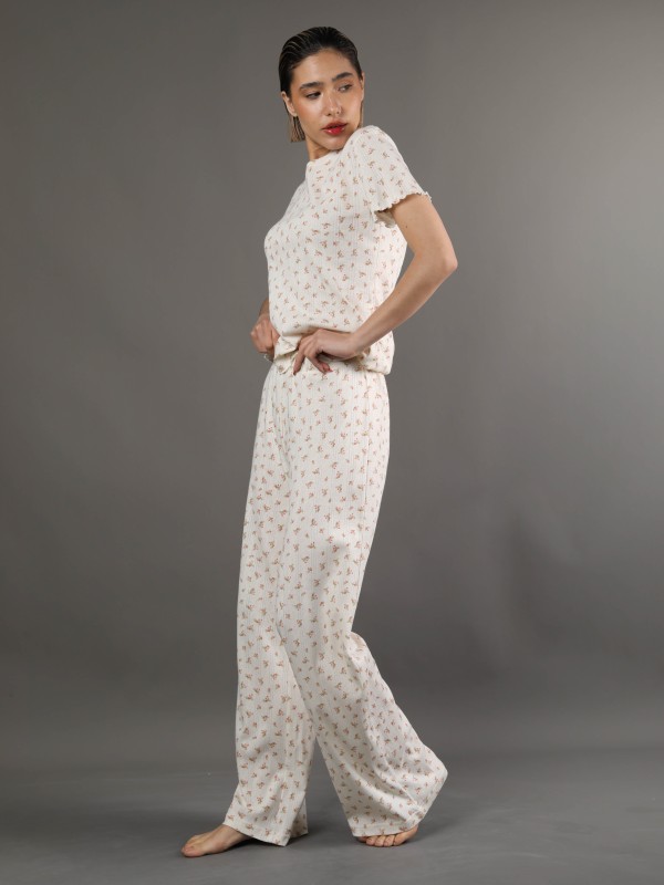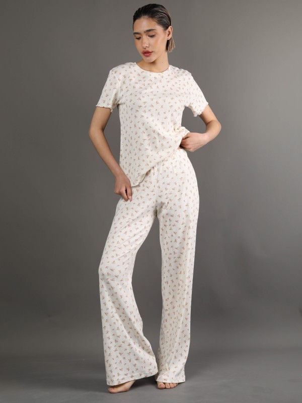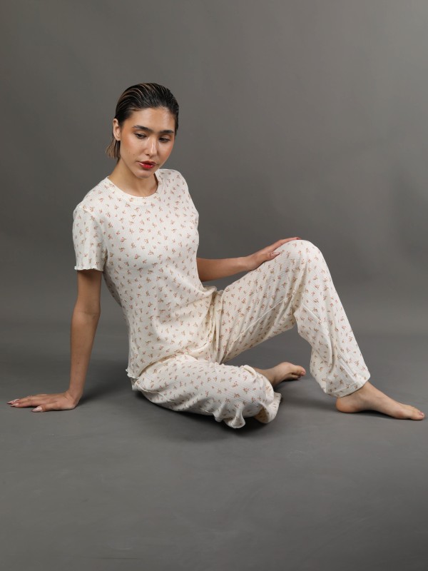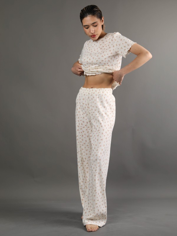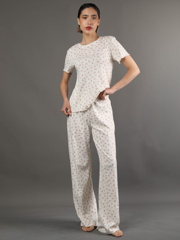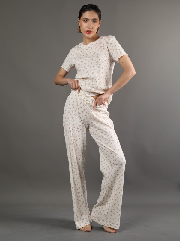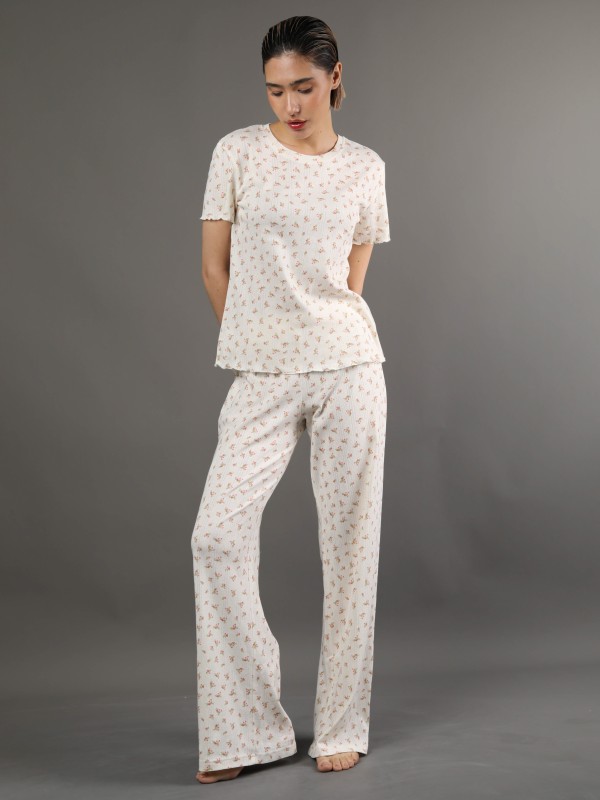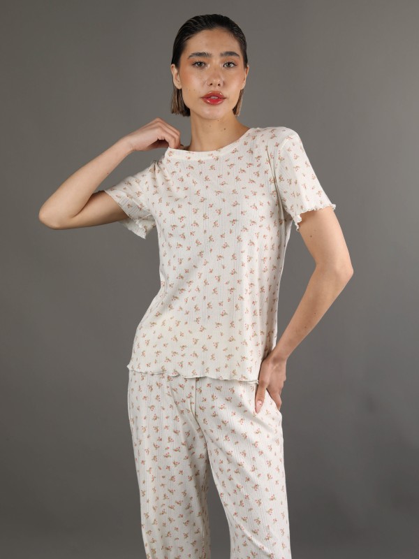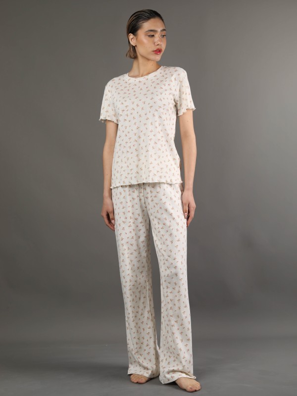 Лёгкая и уютная пижама из дышащего материала подарит максимальный комфорт во время сна и отдыха. Комплект состоит из свободной футболки с коротким рукавом и брюк прямого кроя. Элегантный цветочный принт придаёт образу женственность и нежность.