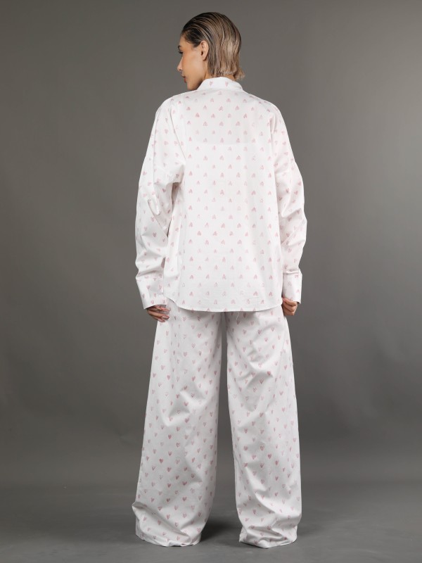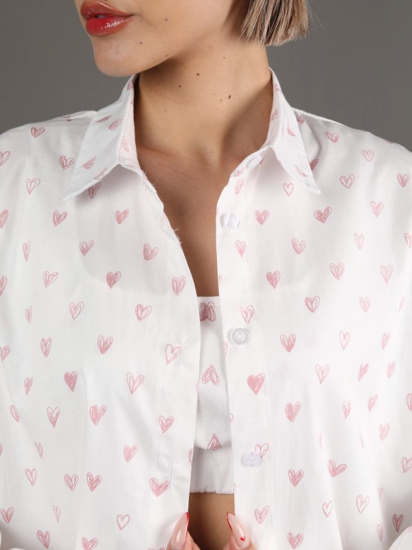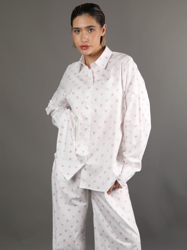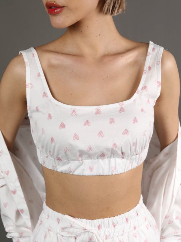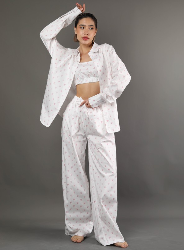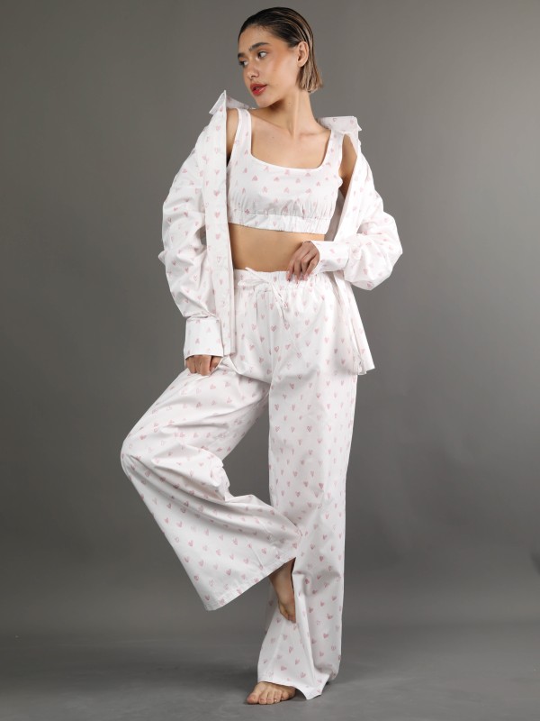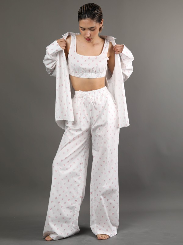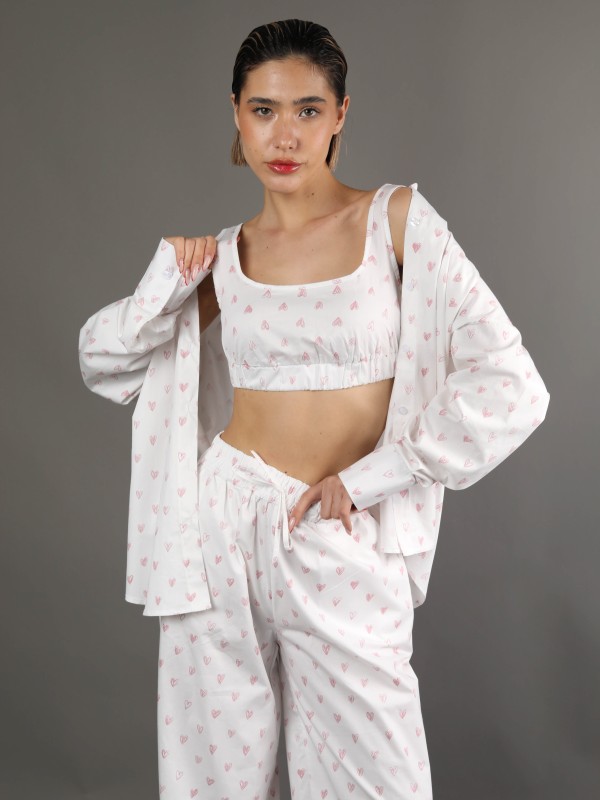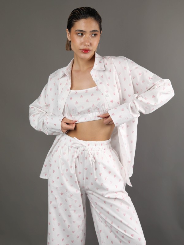 Эта пижама-тройка — идеальное сочетание стиля и комфорта. Комплект состоит из трёх предметов: свободной рубашки на пуговицах, топа на резинке и прямых брюк. Мягкая хлопковая ткань с милым принтом в виде сердечек придаёт образу уют и лёгкость.