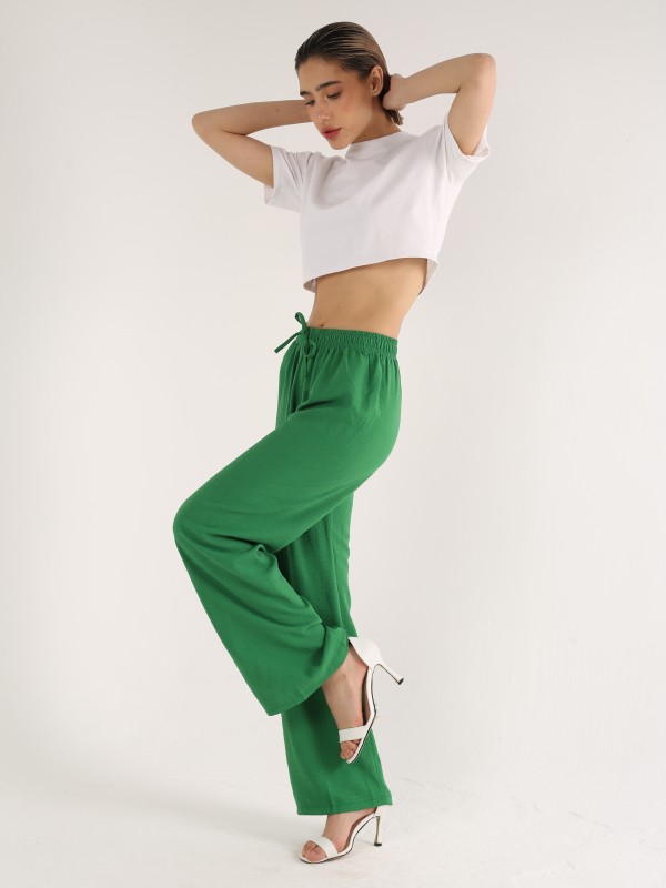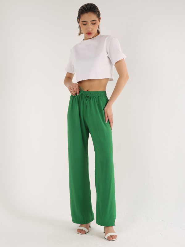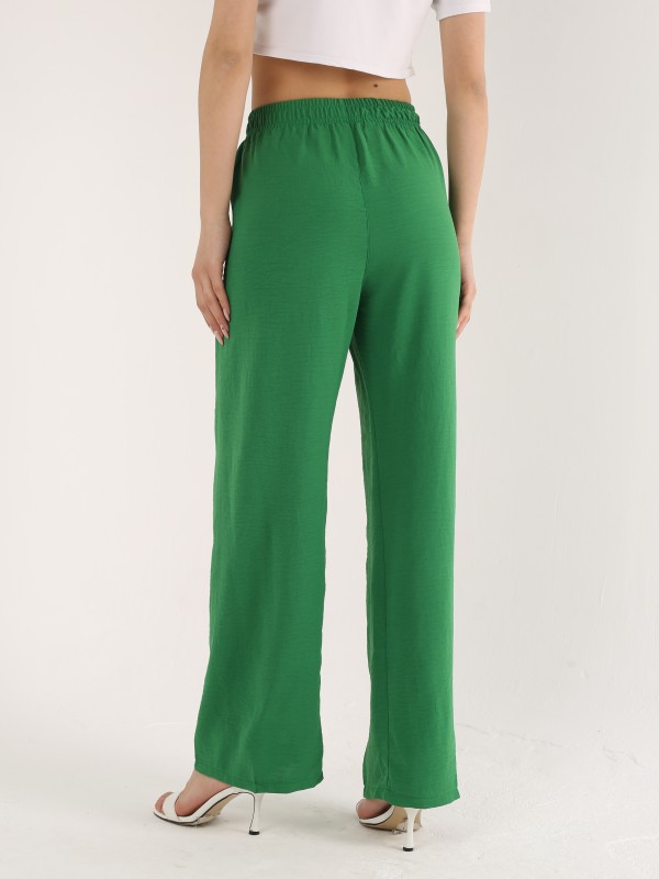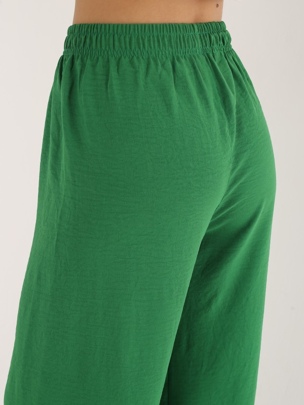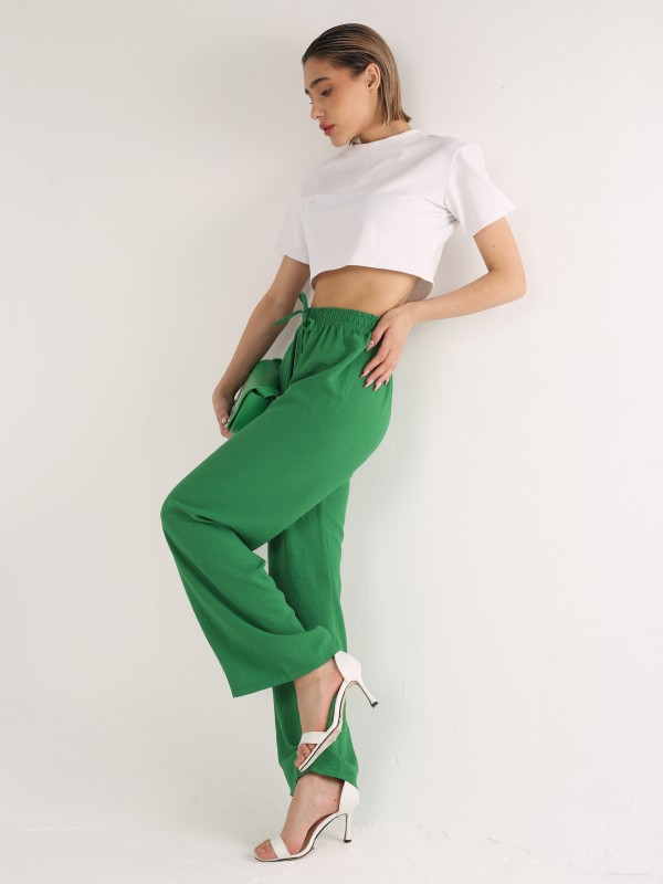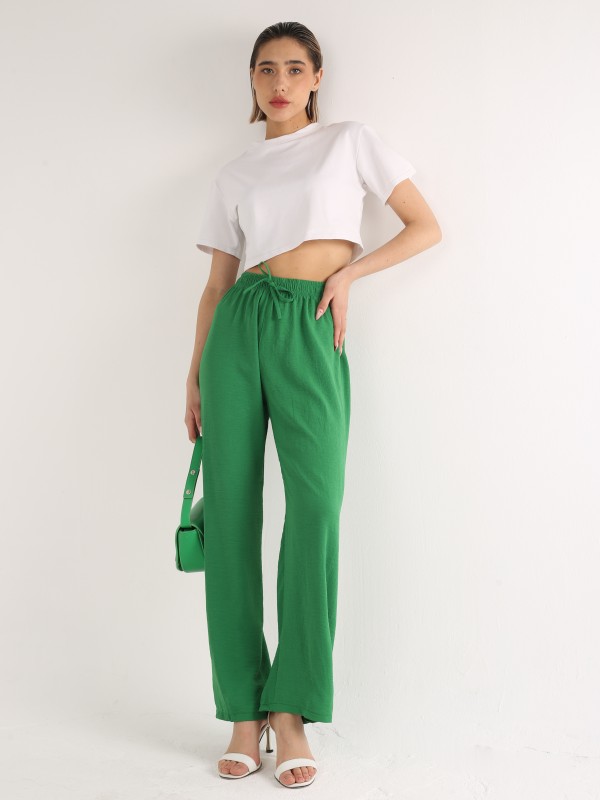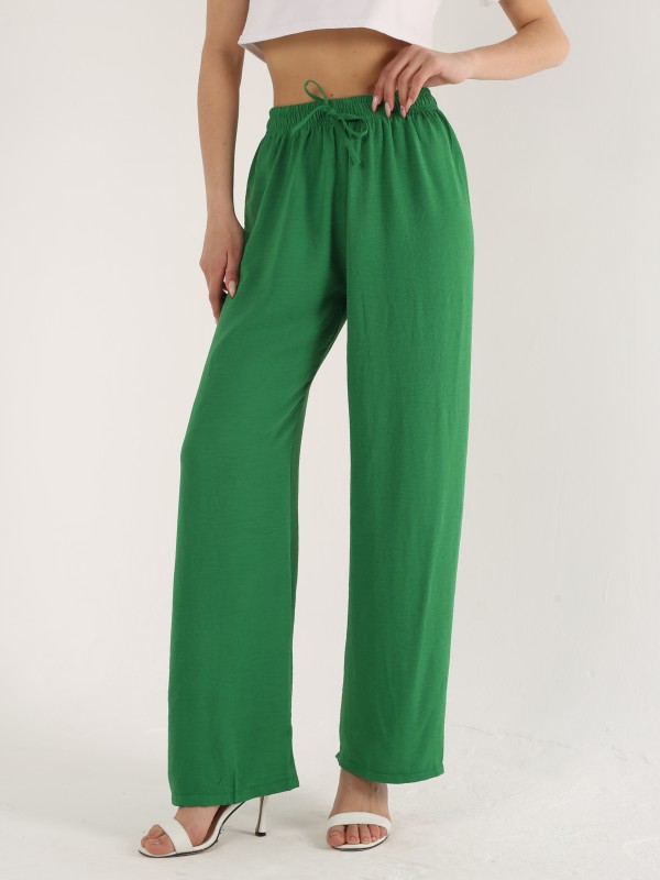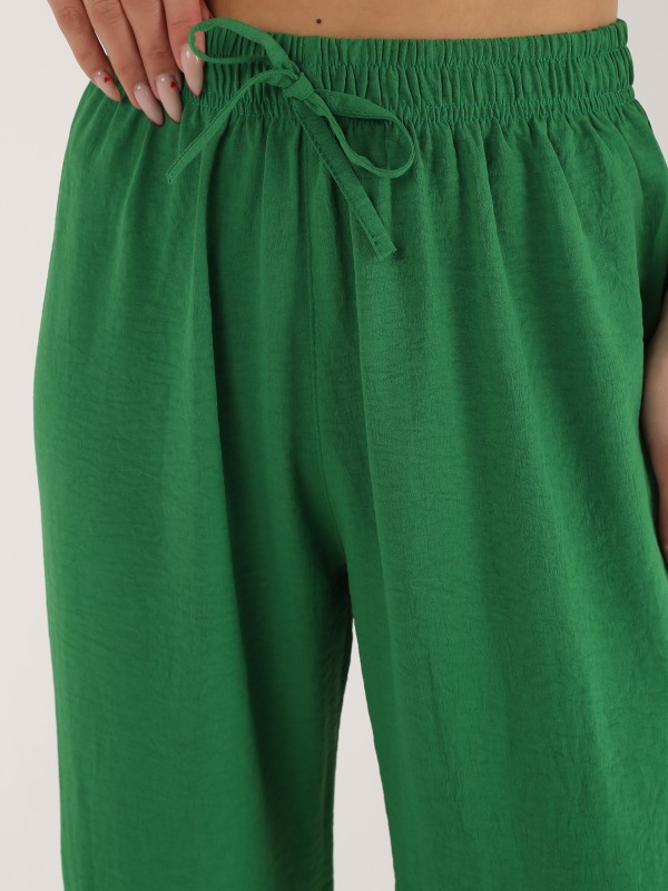 Свободные брюки в ярком зелёном оттенке — идеальный выбор для летнего сезона. Выполнены из дышащей, лёгкой ткани, которая струится по фигуре. Эластичный пояс с завязкой обеспечивает комфортную посадку, а прямой крой визуально удлиняет силуэт.