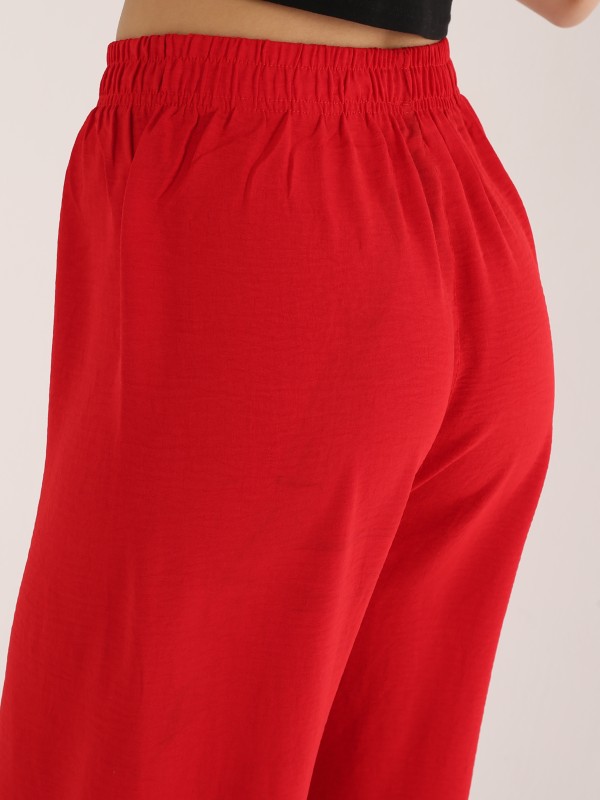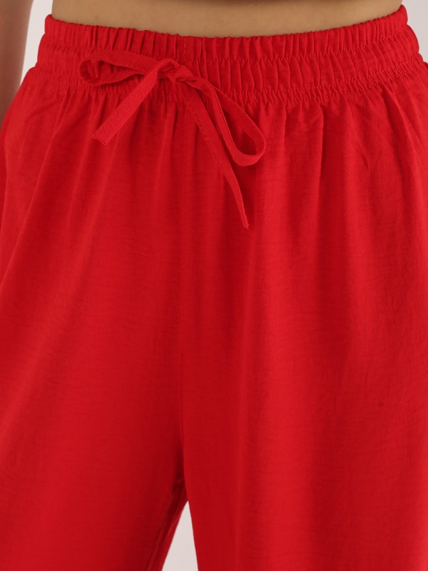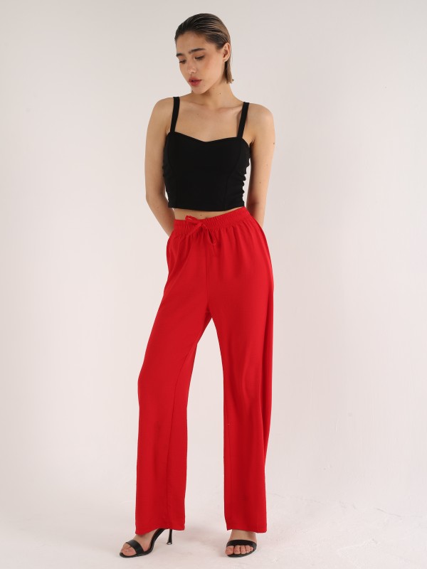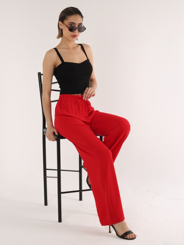 Яркие и стильные брюки насыщенного красного цвета для смелых и уверенных в себе. Выполнены из мягкой, струящейся ткани, обеспечивают свободу движений и эффектный силуэт. Пояс на резинке с завязкой делает модель удобной и универсальной.