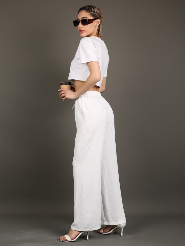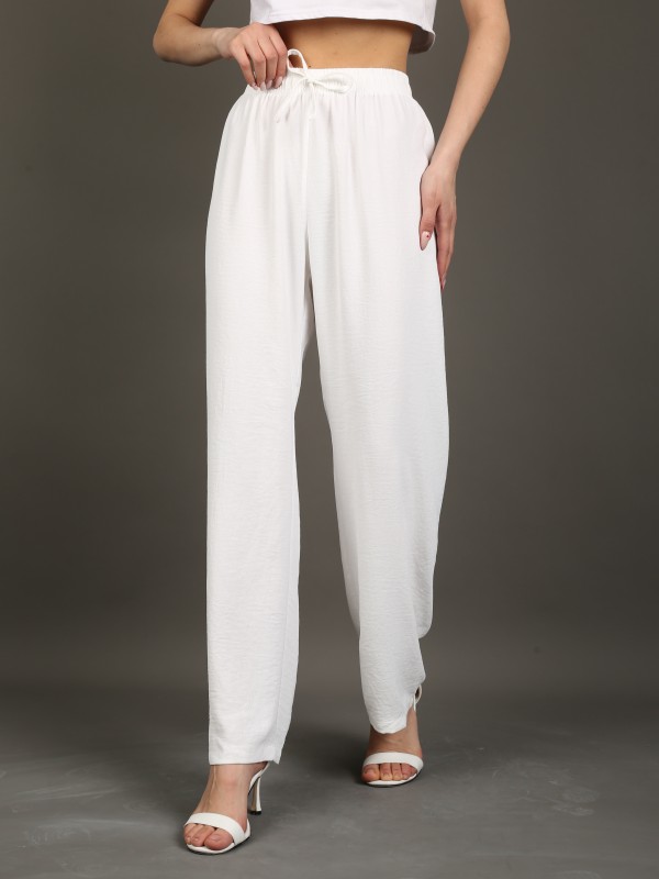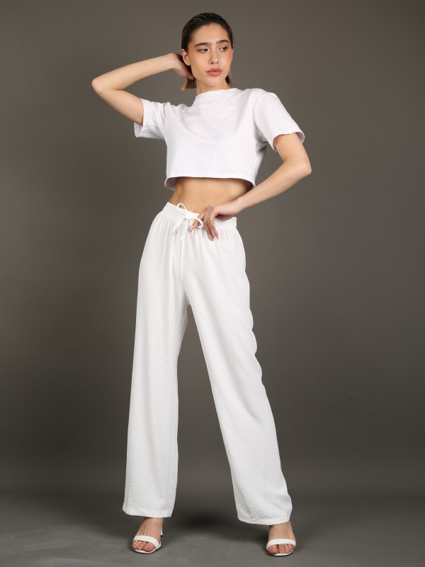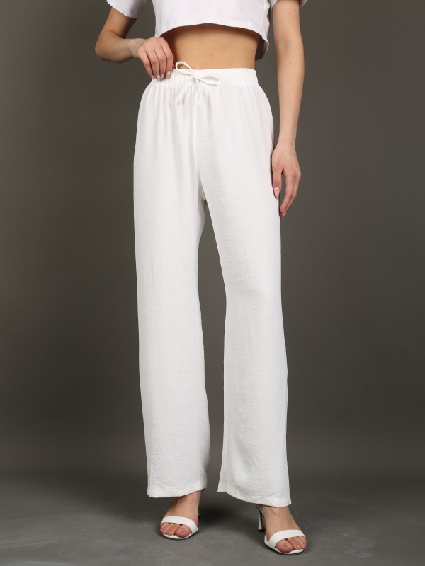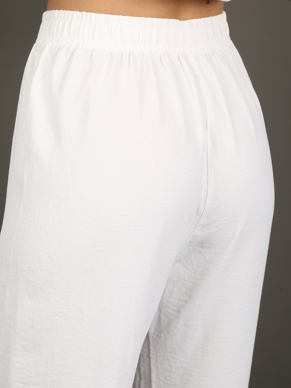Лёгкие свободные брюки в классическом белом цвете. Выполнены из струящейся дышащей ткани, обеспечивают комфорт и свободу движений. Эластичный пояс с завязкой делает посадку удобной и универсальной. Идеальный выбор для летних образов, отпуска и прогулок.