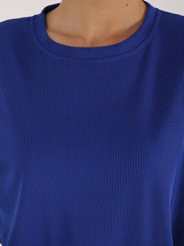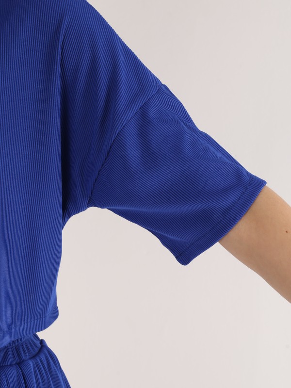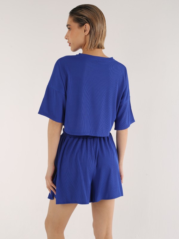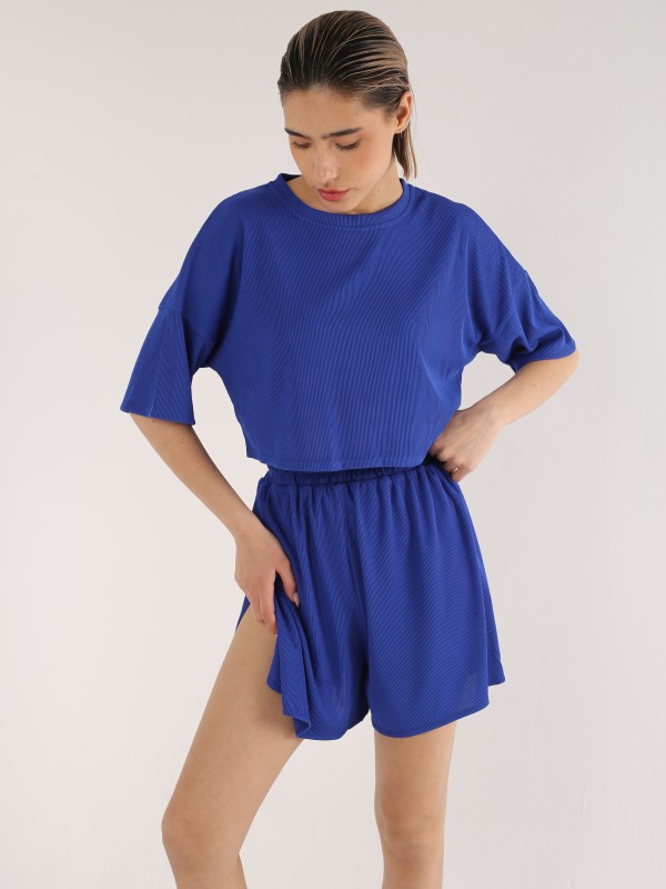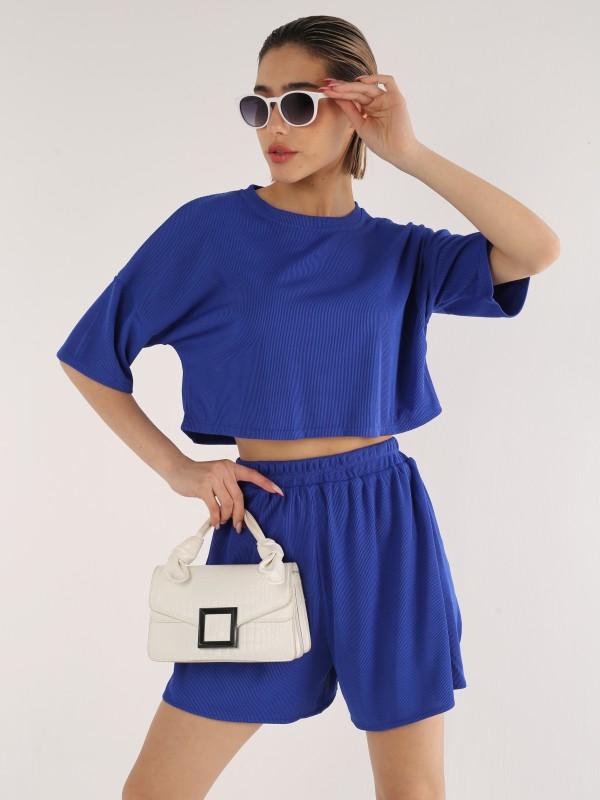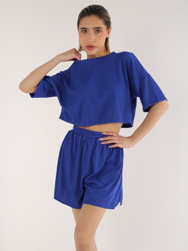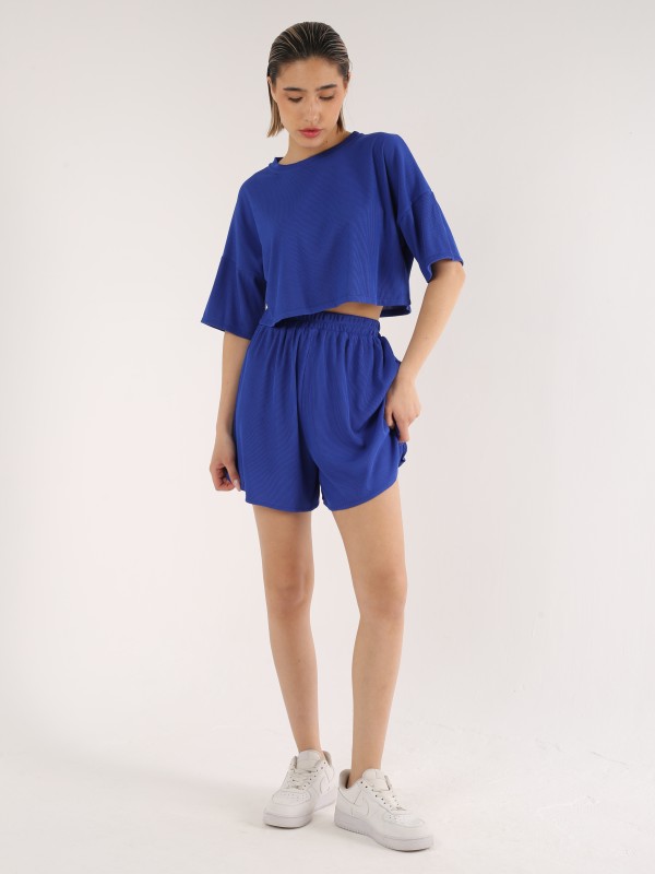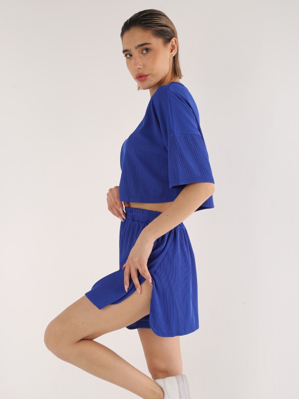 Стильный и лёгкий костюм в насыщенном синем цвете, состоящий из укороченного свободного топа и короткой юбки с разрезом. Идеальный выбор для лета: комфортный, дышащий и модный. Подчёркивает фигуру и отлично смотрится как с кроссовками, так и с босоножками.