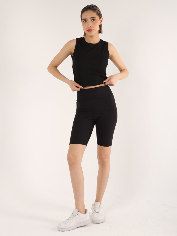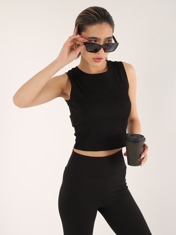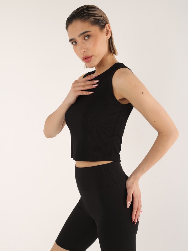 Базовый укороченный топ без рукавов в чёрном цвете. Идеально садится по фигуре благодаря мягкому и эластичному трикотажу с рельефной фактурой. Универсальная модель для спорта, прогулок и повседневных образов в стиле кэжуал.