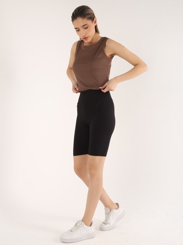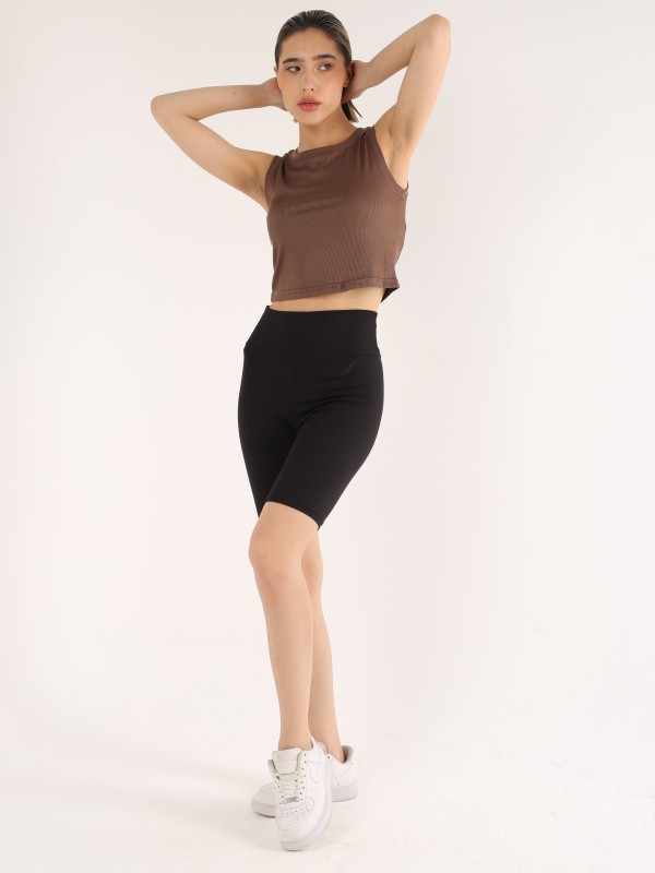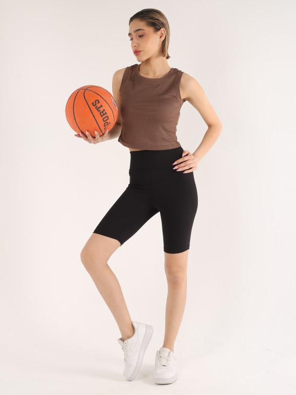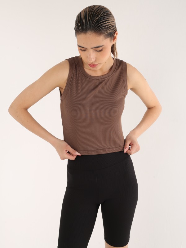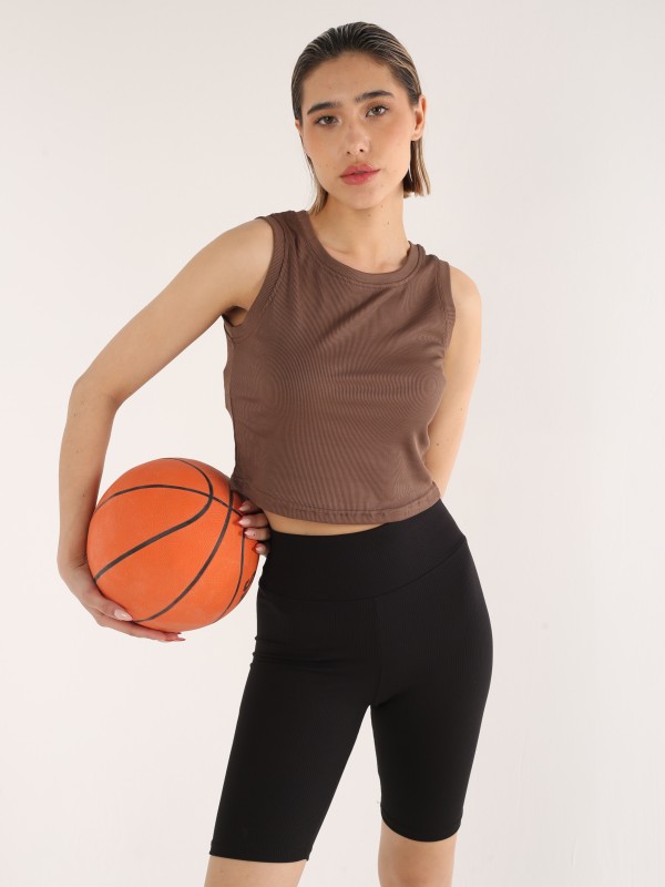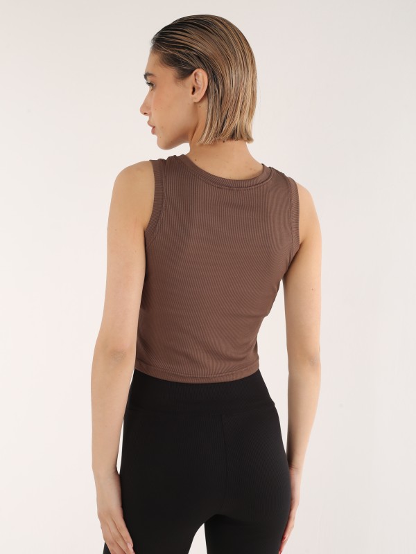 Облегающий трикотажный топ без рукавов в глубоком шоколадном оттенке — стильный и универсальный выбор для спорта, прогулок и повседневных образов. Модель укороченного кроя подчёркивает фигуру и легко сочетается с джоггерами, шортами и велосипедками.