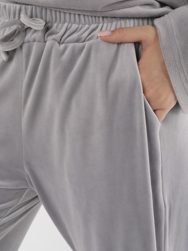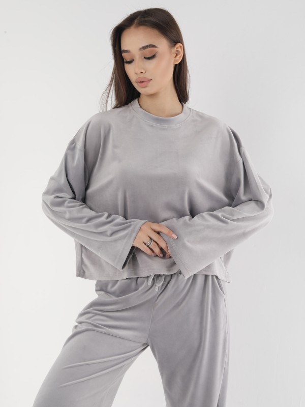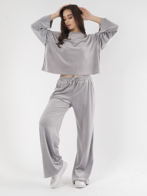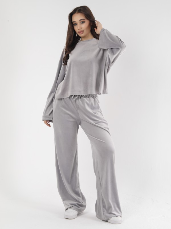 Элегантный костюм из мягкого велюра в спокойном сером оттенке. Свободный кроп-свитшот с длинными рукавами и брюки прямого кроя создают стильный расслабленный образ. Отличный выбор для прогулок, путешествий и уютных вечеров дома.