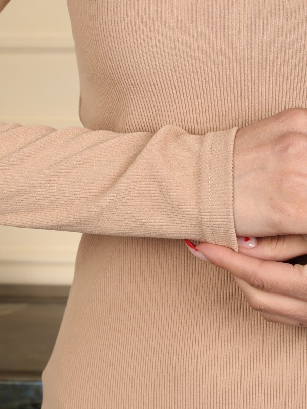 Элегантное бежевое платье миди длины с квадратным вырезом. Облегающий силуэт подчёркивает фигуру, а длинные рукава добавляют утончённости. Модель выполнена из плотного трикотажа с лёгкой эластичностью — для комфорта и стильного внешнего вида. Идеально подходит для деловых встреч, вечеров и особых случаев.