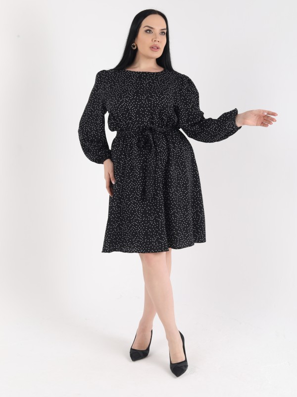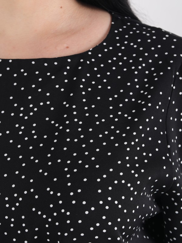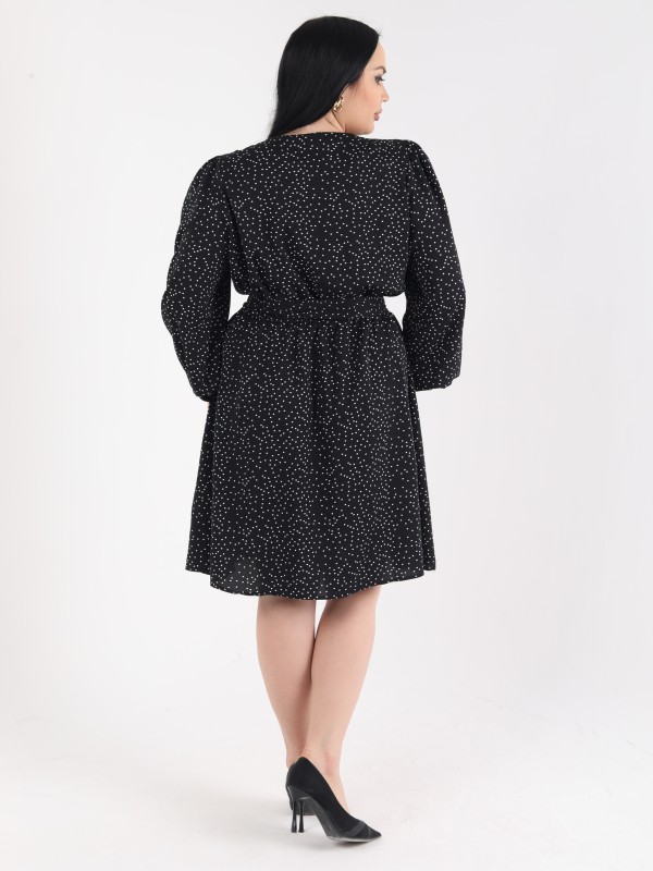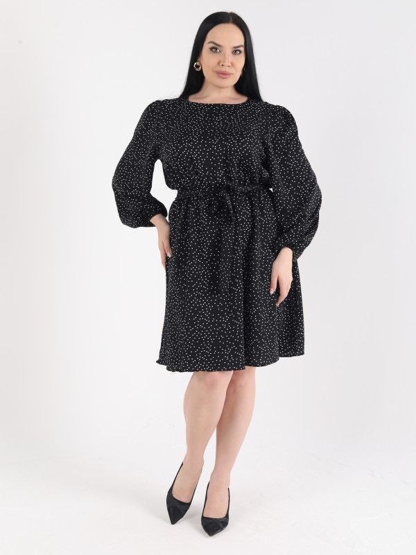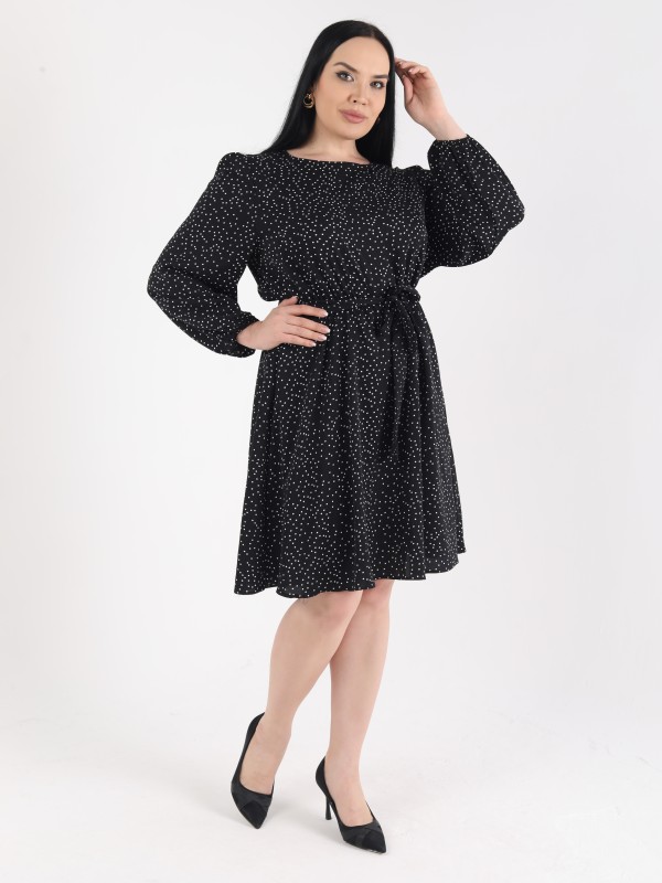 Это черное платье с белым мелким горошком — идеальный выбор для повседневного или офисного образа. Благодаря слегка объемным рукавам и акценту на талии за счёт пояса, силуэт смотрится утончённо и элегантно. Длина до колена придаёт образу строгость, а мягкая ткань обеспечивает комфорт в течение дня.